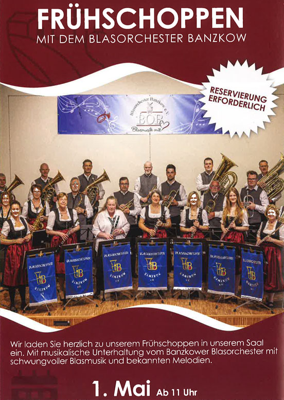 Freitag, den 01. Mai 2026 ab 11.00 Uhr mit dem Blasorchester Banzkow bis 14.00 Uhr